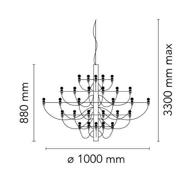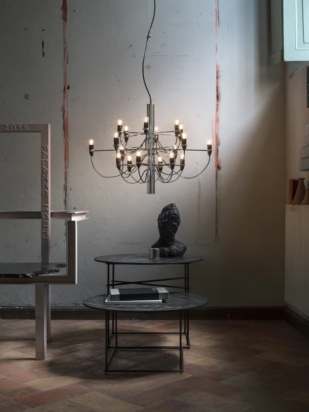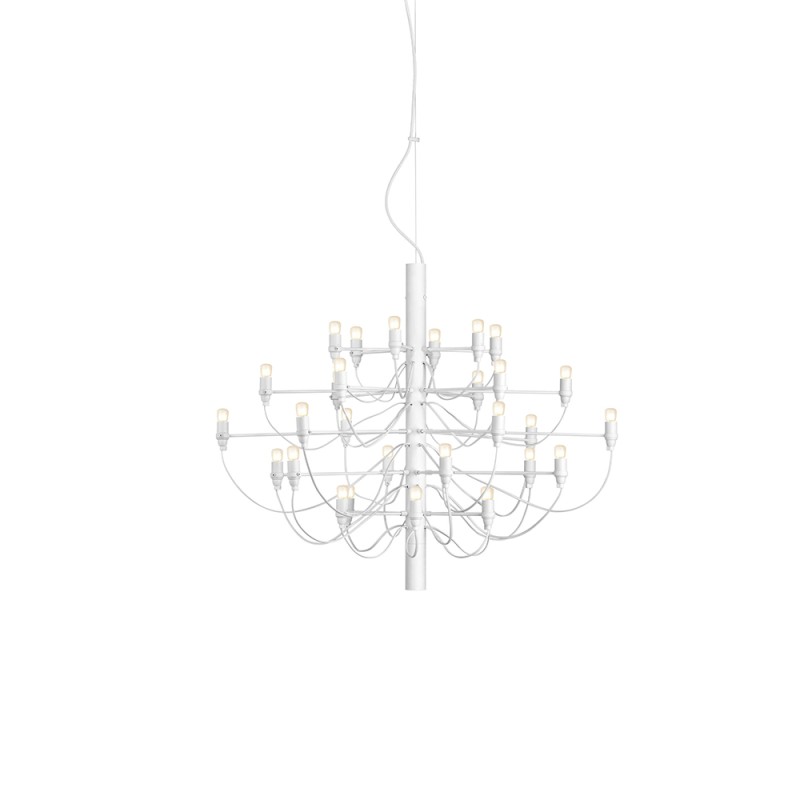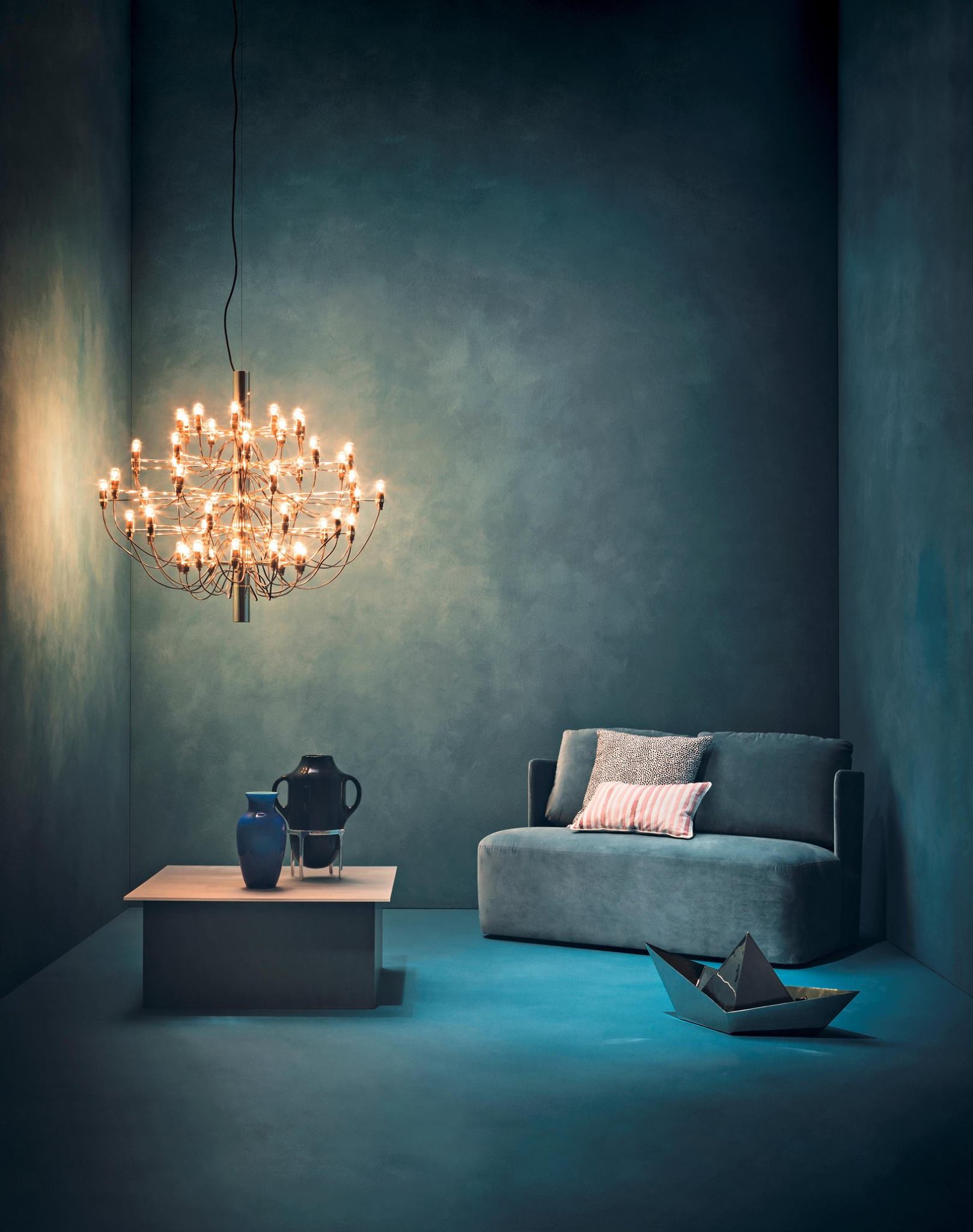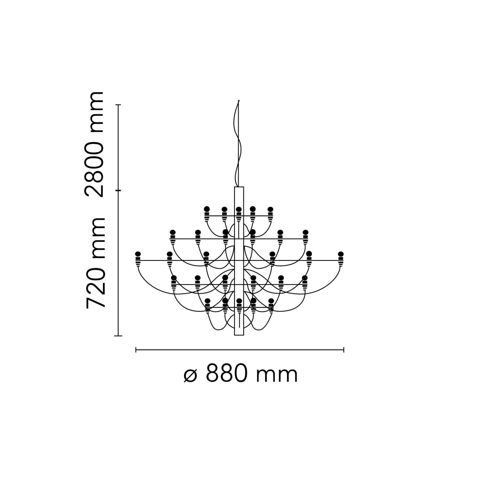 Από τον master του φωτισμού Gino Sarfatti, ένας σύγχρονος πολυέλαιος που συνδυάζει βιομηχανικά στοιχεία με μια θεατρικότητα και διάθεση του μέσου αιώνα. Με έναυσμα την κλασική αισθητική "Chandelier", ο Gino Sarfatti σχεδίασε τον εμβληματικό πολυέλαιο 2097 το 1958. Τόσο οι λαμπτήρες όσο και τα καλώδια είναι εμφανή, προκύπτοντας έτσι ένα μοντέρνο και μινιμαλιστικό σχήμα. Αρχικά ο πολυέλαιος 2097 δημιουργήθηκε με 18, 30 και 50 λαμπτήρες. Τώρα επεκτείνεται σε μια νέα σύνθεση 75 λαμπτήρων, μια επιβλητική φωτεινή παρουσία, ύμνος στον έξυπνο σχεδιασμό.