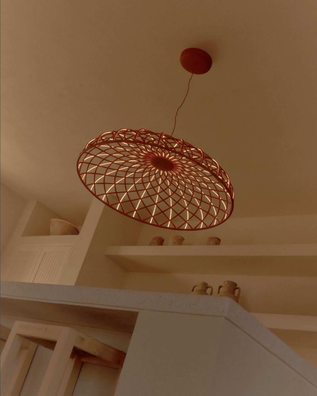 Η αυθάδης και ποιητική σχεδιαστική γλώσσα του Marcel Wanders βρίσκει μια νέα έκφραση στο Skynest, την τελευταία του δημιουργία για τη Flos. Ένας συνδυασμός επίσημης κομψότητας και τεχνικής καινοτομίας. Το Skynest διαθέτει μια καινοτόμο λωρίδα LED, πλεγμένη με υφασμάτινο καλώδιο για να δημιουργήσει ένα σχήμα σαν καλάθι. Μια αιθέρια, ανάλαφρη παρουσία, σαφώς εμπνευσμένη από τον κόσμο της χειροτεχνίας αλλά με απροσδόκητη τεχνολογία.