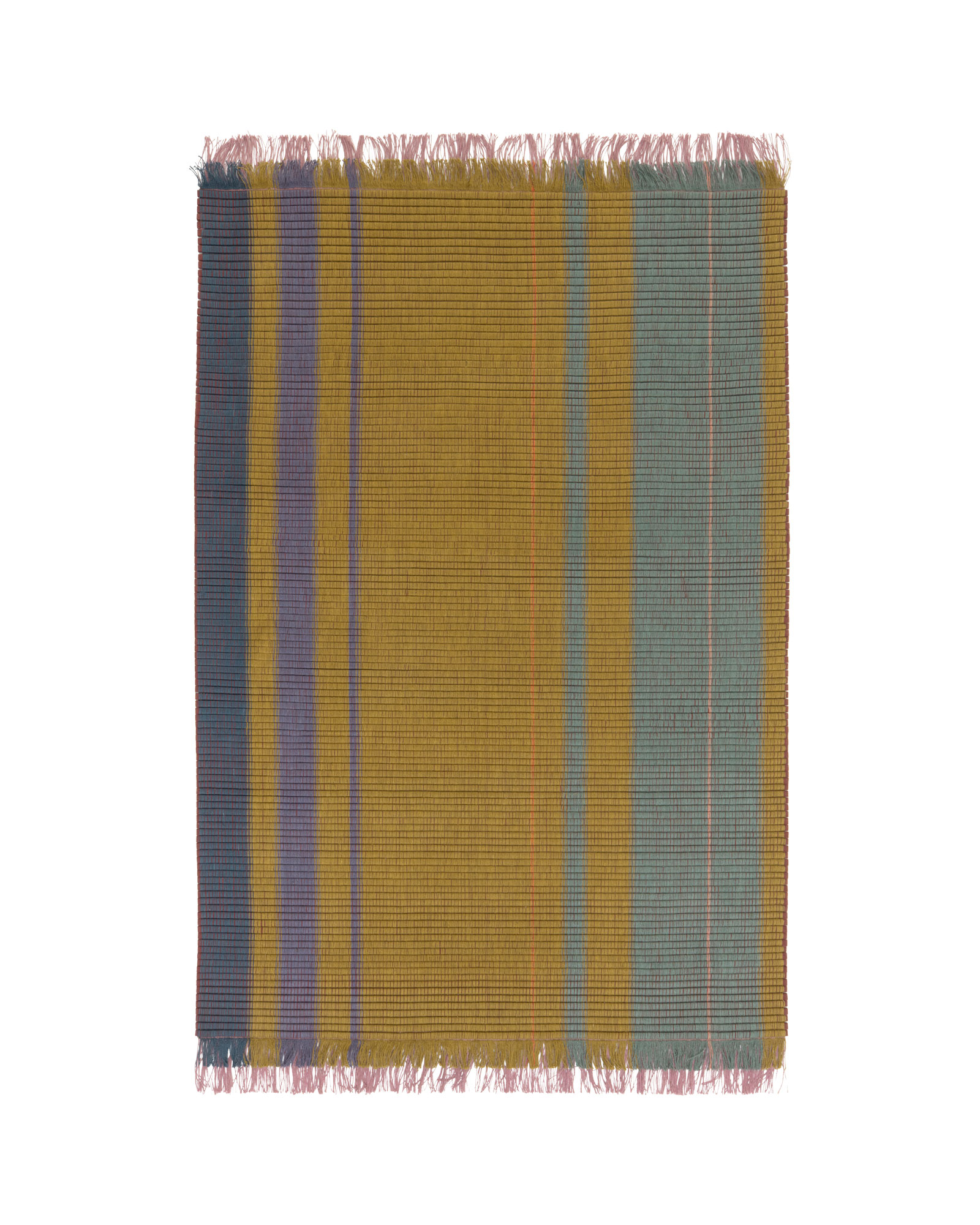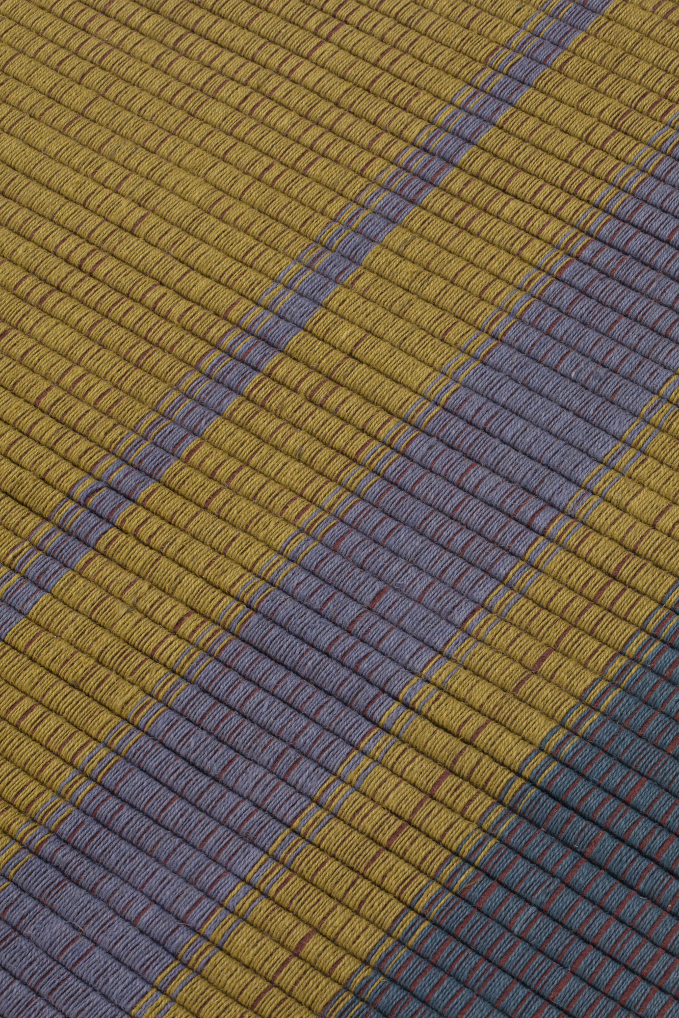 Σχεδιασμένη από την Mae Engelgeer, η συλλογή Omote διερευνά τη μινιμαλιστική δομή του παραδοσιακού ιαπωνικού χαλιού tatami, πειραματιζόμενη με την μέθοδο του αργαλειού. Φυσικά νήματα υφαίνονται γύρω από τη ζεστή και μονωτική τσόχα, αναδημιουργώντας την ελαστικότητα και την απαλότητα του χαλιού τατάμι.